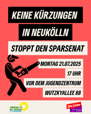Die Grünen Neukölln und die Linke Neukölln rufen auf zur Kundgebung: Keine Kürzungen in Neukölln. Stoppt den Sparsenat!