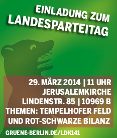 Neben finanziellen Dingen steht diesmal die Vorbereitung des Grünen Landesparteitags (LDK) am kommenden Samstag im Mittelpunkt. Wir wollen uns dabei insbesondere mit dem Leitantrag zum Tempelhofer Feld befassen. Die Tagesordnung der LDK ist <link http: gruene-berlin.de ldk141 external-link-new-window externen link in neuem>hier auf der Seite unseres Landesverbands einsehbar, die vorliegenden Anträge <link http: ldk-berlin.antragsgruen.de external-link-new-window externen link in neuem>können hier online gelesen bzw. heruntergeladen werden.