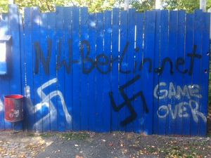 Bündnis 90/Die Grünen Neukölln sind entsetzt über den erneuten Versuch, die Neuköllner Falken (Anton Schmaus-Haus) einzuschüchtern. Besonders ekelhaft ist der Spruch "Ihr interessiert uns brennend", den Rechtsextreme an den Zaun gesprüht haben. Nach dem zweimaligen Brand, Juni und November letzten Jahres, hat sich erst vor kurzem eine Versicherung gefunden, die das Anton-Schmaus-Haus wieder versichert. Die Verursacher haben nicht nur Hakenkreuze und anderes gesprüht, sie haben auch klargemacht, wer dahinter steckt: NW-Berlin (Nationaler Widerstand), siehe Fotos!