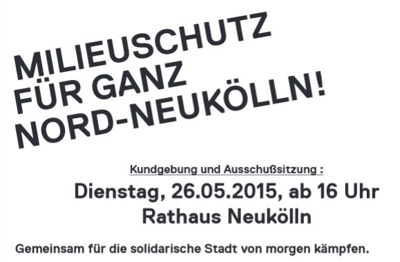 In Neukölln hat sich das "Bündnis bezahlbare Mieten Neukölln" mit einem Einwohnerantrag für einen Millieuschutz im gesamten Norden des Bezirks eingesetzt. Dieser soll nun in einer Ausschusssitzung am 26. Mai 2015 um 17 Uhr im Rathaus Neukölln diskutiert werden.