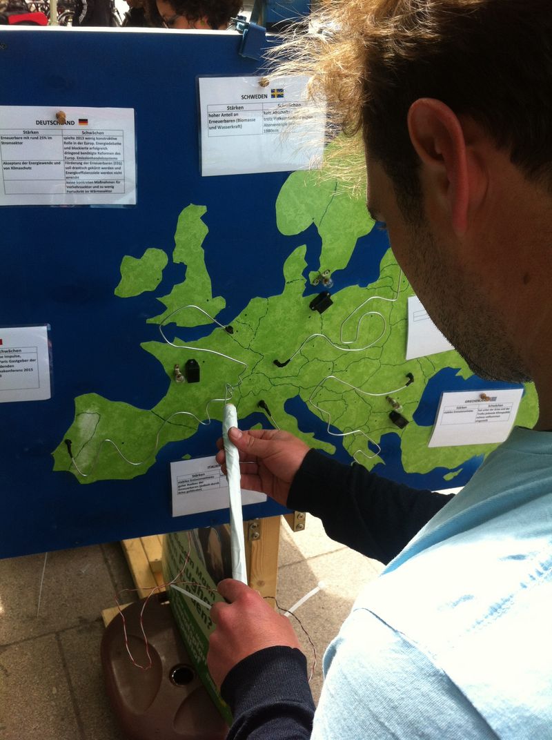 Die Neuköllner Grünen haben am vergangenen Samstag am Maybachufer kreativ für mehr Klimaschutz und eine europaweite Energiewende geworben. Am Maybachufer wurden die Besucher_innen des Marktes von den Aktiven der grünen AG Klimawandel mit Infomaterial versorgt. Neben interessanten Gesprächen bei strahlendem Sonnenschein würde auch spielerisch versucht, die komplexe Energie- und Klimapolitik der Europäischen Union den Menschen näher zu bringen. Hierzu gab es das <link http: de.wikipedia.org wiki external-link-new-window externen link in neuem>Geschicklichkeitsspiel "Der Heiße Draht" als EU-Ausgabe, bei der die Spieler_innen die Drahtöse über eine Europakarte navigieren mussten, ohne den Signalton auszulösen. Das Ganze wurde verbunden mit vielen Hintergrundinformationen zur Klimapolitik in den einzelnen Mitgliedsstaaten.