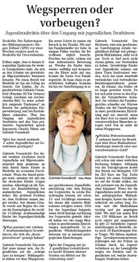 Die Neuköllner Ausgabe der Berliner Woche interviewte für die Ausgabe vom 21. Februar 2007 Gabriele Vonnekold zum Umgang mit jugendlichen Straftätern. Dabei betont unsere Jugendstadträtin, dass es das erste Ziel immer sein muss, "die Jugendlichen auf die "richtige Spur zu bringen." Hilfsangebote… mehr