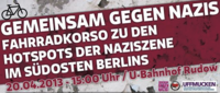 Auch im Vorfeld der großen Anti-Nazi-Demonstration am 01. Mai 2013 gibt es viele antifaschistische Aktionen in der ganzen Stadt. Auf eine möchten wir ganz besonders hinweisen: auf den Fahrradkorso am 20. April gegen die Naziszene im Südosten Berlins, der unter anderem durch Rudow führt. Dazu hier… mehr
