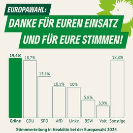 Wir sind stärkste Kraft in Berlin und Neukölln – und dennoch können wir mit den Ergebnissen bei der Europawahl nicht zufrieden sein. Sowohl bundesweit als auch im Bezirk haben wir im Vergleich zur Europawahl 2019 deutlich verloren. Noch größere Sorgen macht uns der Aufschwung der AfD und anderer rechter Parteien in Europa.